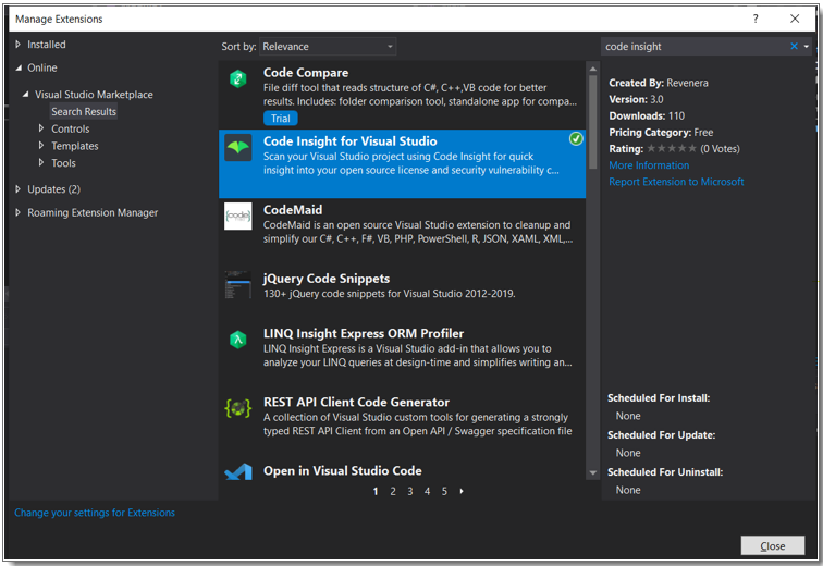- In the Extensions and Updates tree, search for the Code Insight for Visual Studio extension in the Online | Visual Studio Marketplace category (or the Visual Studio Gallery category, depending on the Visual Studio version). The following shows the menu flow for the extension in Visual Studio 2019.