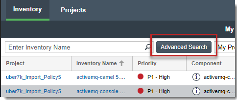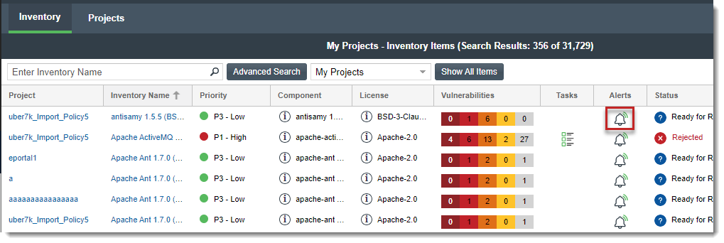 To view the open and closed alerts for a given inventory item associated with a given project, locate the item, and click the