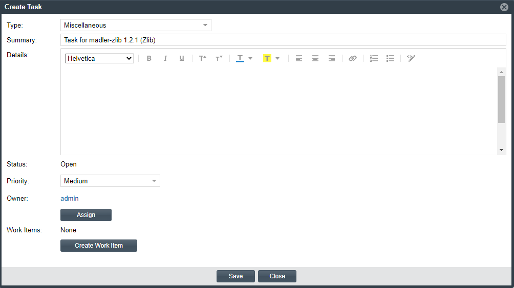 - To create an external work item associated with the task, click the Create Work Item button. (See Creating and Viewing External Work Items for a Project Inventory Task for details.)